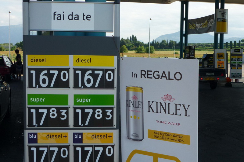 На сегодняшний день в Италии средняя цена за литр бензина и дизельного топлива составляет 1,642 евро и 1,465 евро соответственно. В тоже время средний уровень цен по странам Европейского Союза - 1,338 и 1,171 евро за литр.