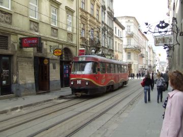 Ну и узкие улочки Львова по которым, оказывается ездит еще и городской трамвай...